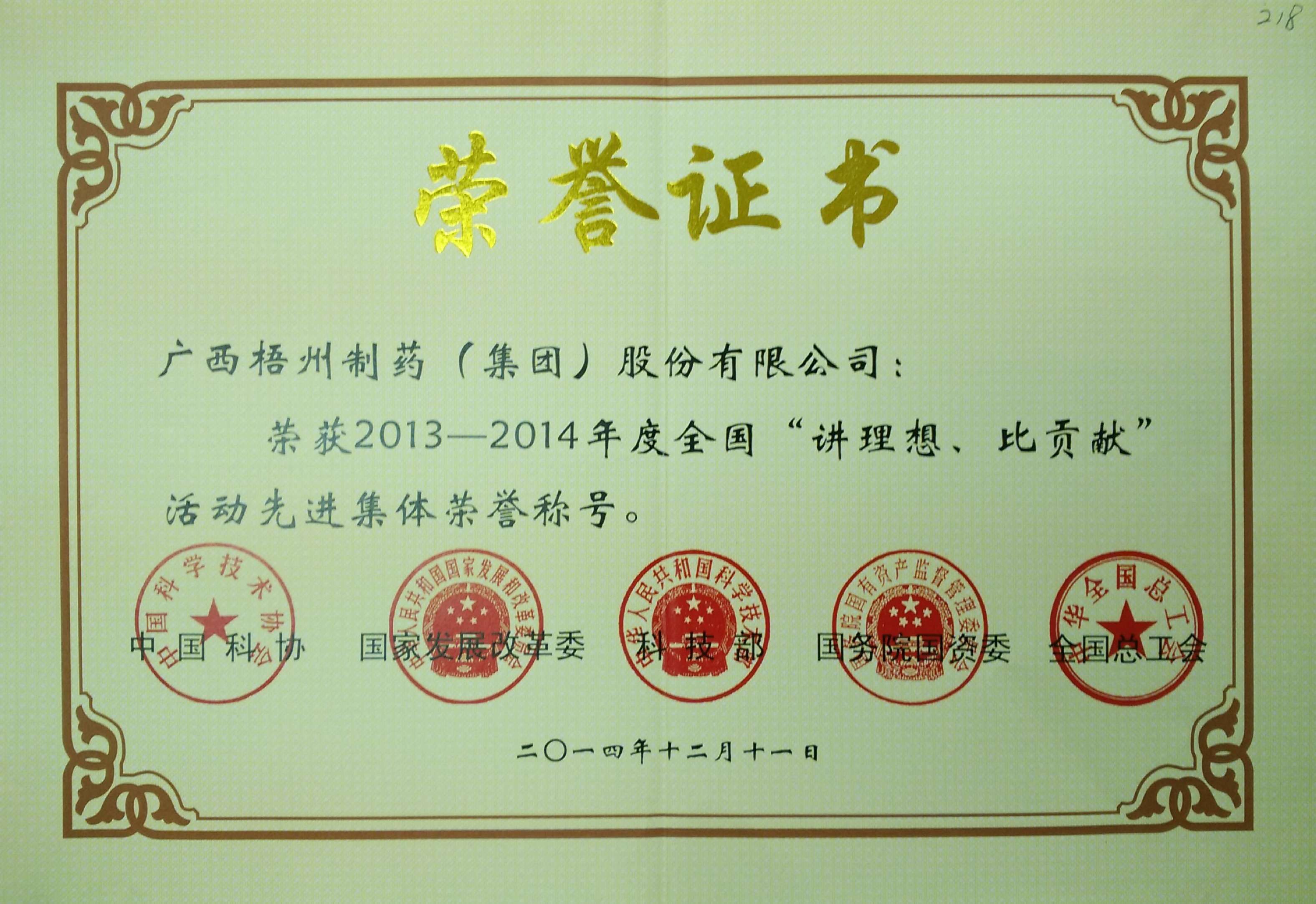 榮獲2013-2014年度全國“講理想,比貢獻(xiàn)”活動(dòng)先進(jìn)集體榮譽(yù)稱號(hào)