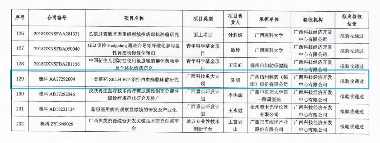 根據(jù)廣西科技項(xiàng)目評(píng)估中心發(fā)布的“廣西科技計(jì)劃項(xiàng)目擬定驗(yàn)收結(jié)論公示”(公示期:2022年7月22日—28日),中恒集團(tuán)梧州制藥承擔(dān)的廣西科技重大專(zhuān)項(xiàng)《一類(lèi)新藥SKLB677治療白血病的臨床前研究》項(xiàng)目通過(guò)驗(yàn)收。