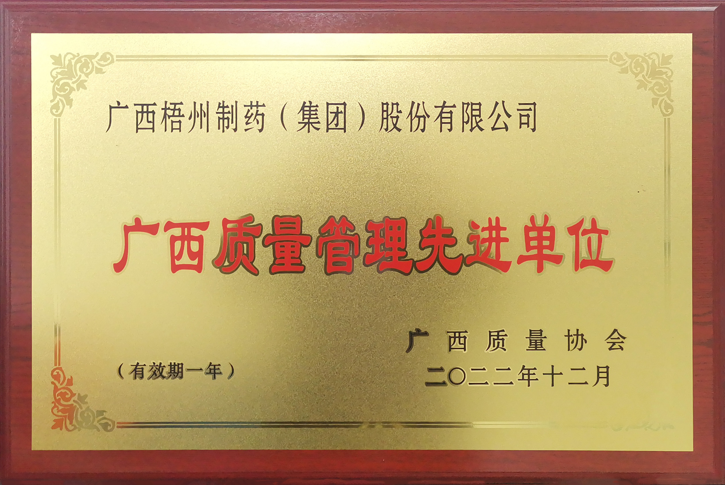廣西梧州制藥(集團(tuán))股份有限公司榮獲2022年度廣西質(zhì)量管理先進(jìn)單位