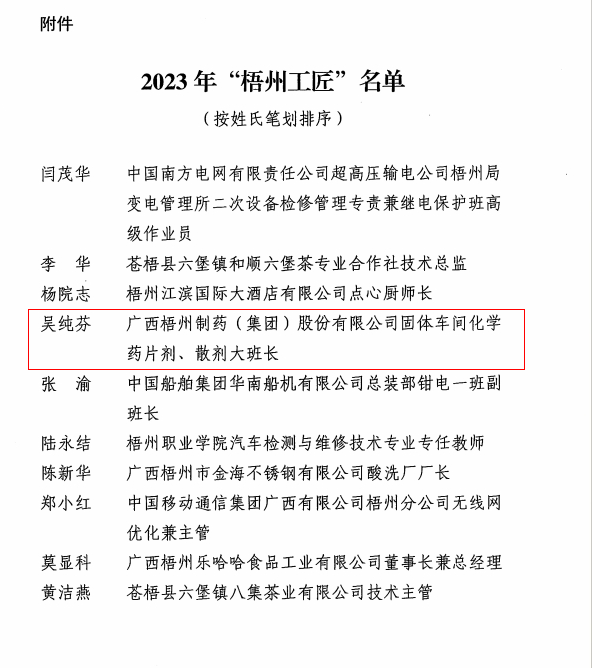 近日,梧州市總工會、梧州市工業(yè)和信息化局、梧州市科學(xué)技術(shù)局、梧州市人力資源和社會保障局聯(lián)合發(fā)布《關(guān)于命名2023年“梧州工匠”的通報》,梧州市有10名同志被選樹為“梧州工匠”,其中,梧州制藥固體車間化吳純芬獲此殊榮。