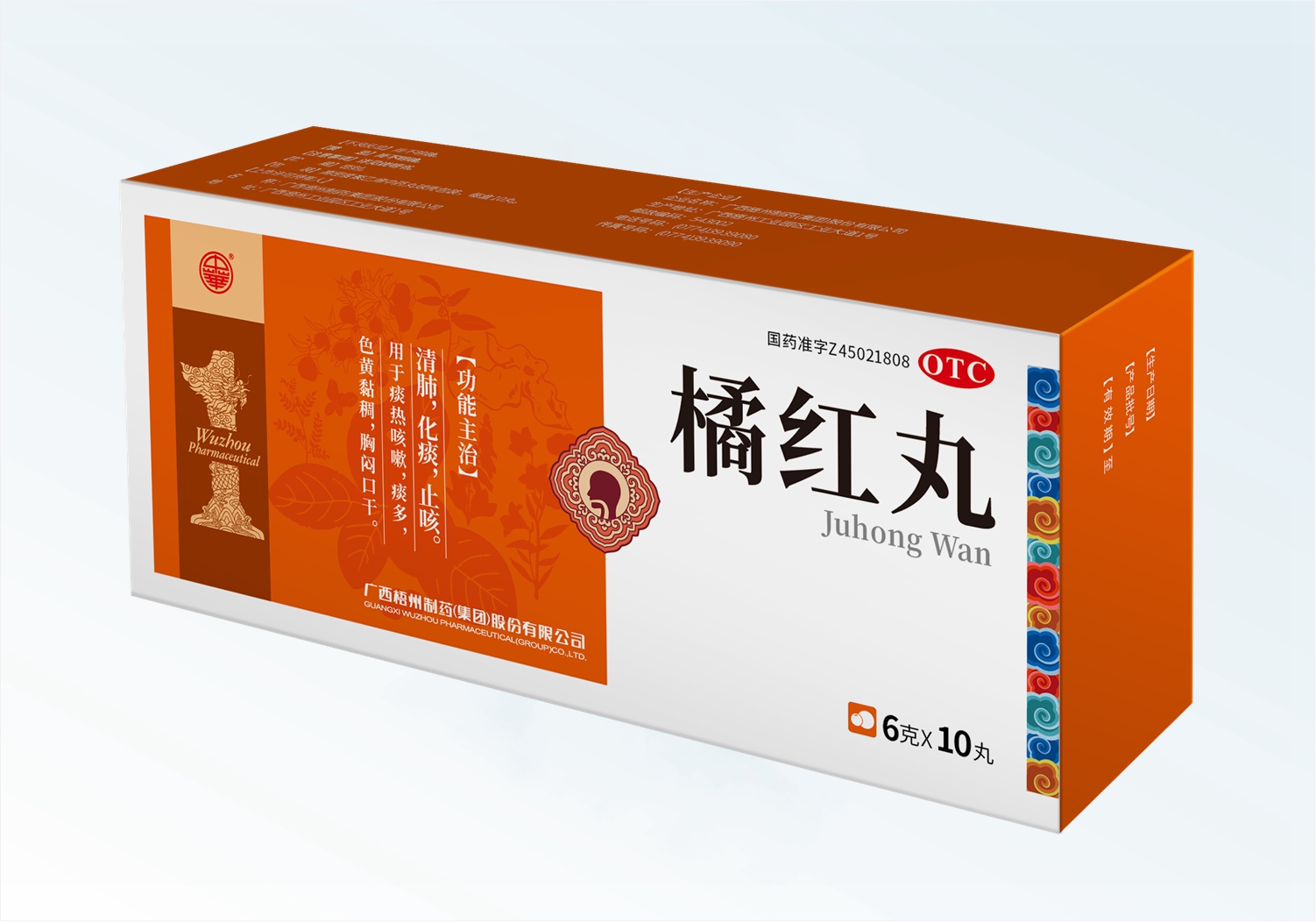 【藥品名稱】通用名稱:橘紅丸漢語(yǔ)拼音:JuhongWan【成份】化橘紅、陳皮、半夏(制)、茯苓、甘草、桔梗、苦杏仁、炒紫蘇子、紫菀、款冬花、瓜蔞皮、浙貝母、地黃、麥冬、石膏。輔料為蜂蜜?!拘?nbsp