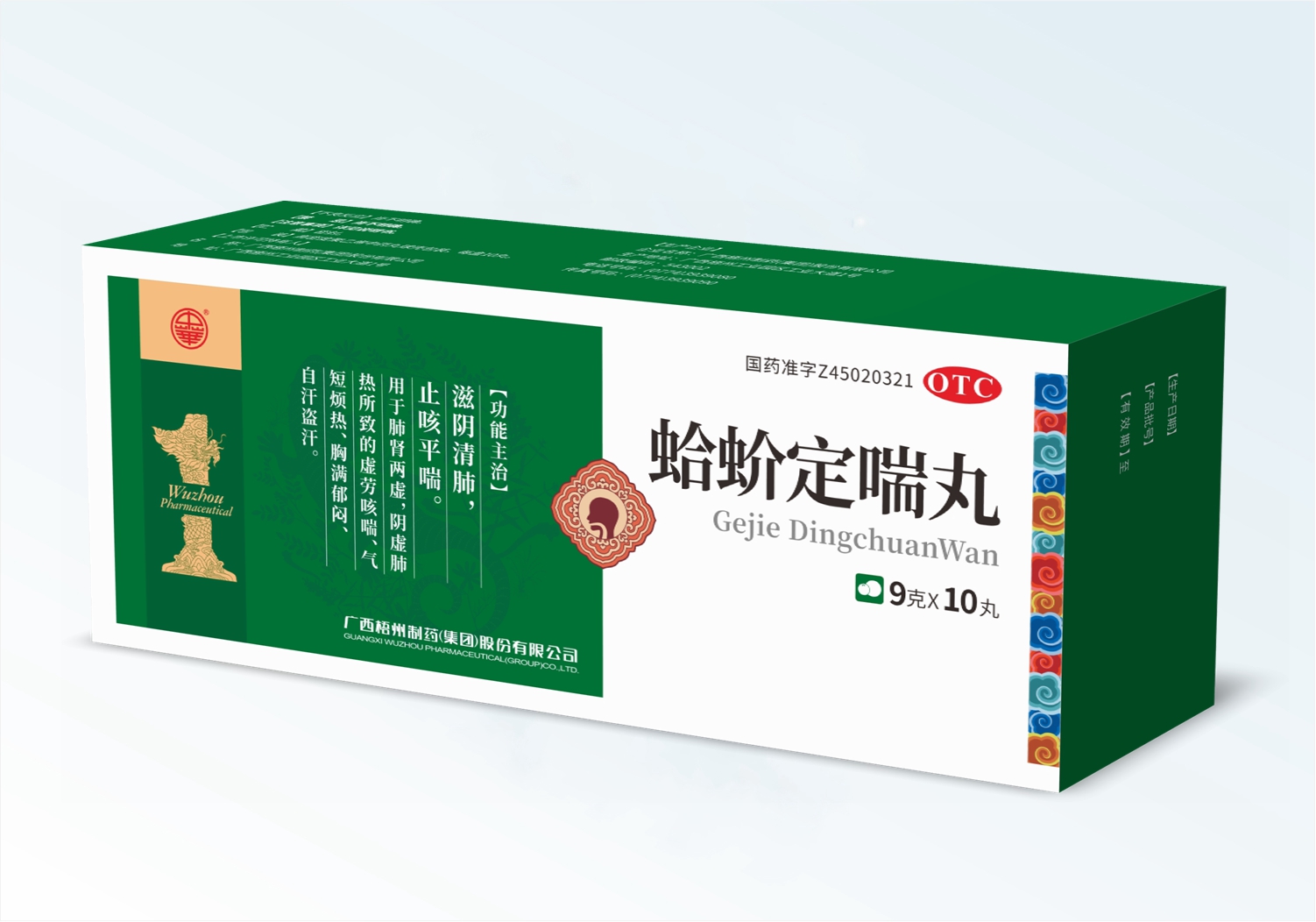 【藥品名稱】通用名稱:蛤蚧定喘丸漢語拼音:Gejie DingchuanWan【成份】蛤蚧、瓜萎子、紫菀、麻黃、醋鱉甲、黃苓、甘草、麥冬、黃連、百合、炒紫蘇子石膏、炒苦杏仁、煅石膏。輔料為蜂蜜?!拘誀睢勘酒窞楹诤稚拇竺?