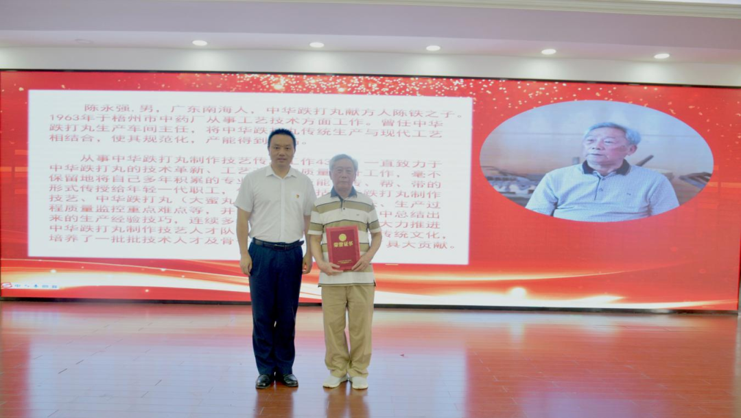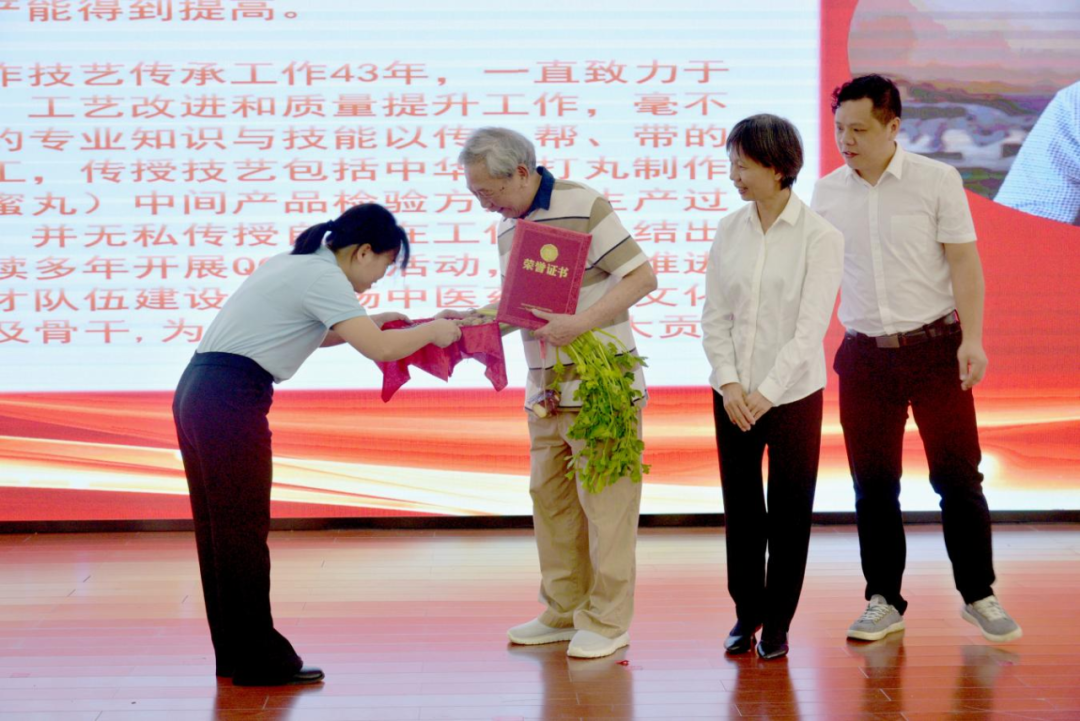 活動還專門邀請了中華跌打丸獻方人陳鐵的兒子,現(xiàn)已83歲高齡的原跌打丸生產(chǎn)車間主任陳永強到會,由公司黨委書記、董事長黃文彩為其頒發(fā)“中華跌打丸制作技藝——金牌師父”榮譽稱號?!爸腥A跌打丸制作技藝”的第三、第四、第五代非遺傳承人依次上臺,同樣用傳統(tǒng)的束脩六禮對陳老進行了謝師,以此來表達對師父的感激之情、教導之恩。
