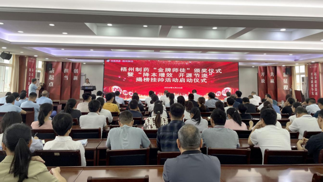 4月24日上午,一場感恩與奮進的“金牌師徒”頒獎儀式暨“降本增效 開源節(jié)流”揭榜掛帥活動啟動儀式隆重舉行。梧州制藥領(lǐng)導班子成員,各部門、各車間職工代表,及獲評星級的“金牌師徒”共150余人參加活動。