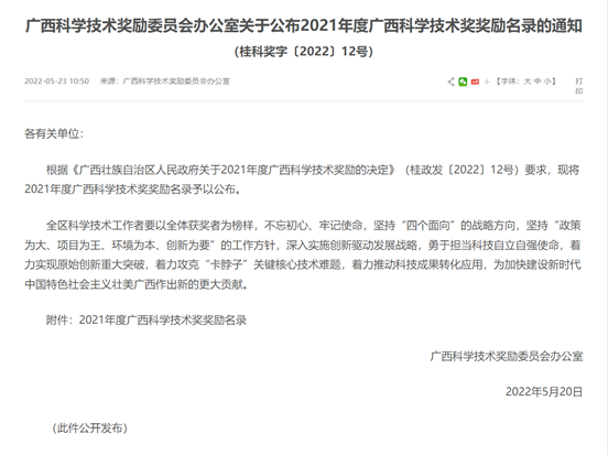 近日,廣西科學(xué)技術(shù)獎勵委員會辦公室發(fā)布《關(guān)于公布2021年度廣西科學(xué)技術(shù)獎獎勵名錄的通知》(桂科獎字〔2022〕12號),2021年度廣西科學(xué)技術(shù)獎揭曉,162項科技成果榜上有名,其中梧州制藥與天津中醫(yī)藥大學(xué)、浙江大